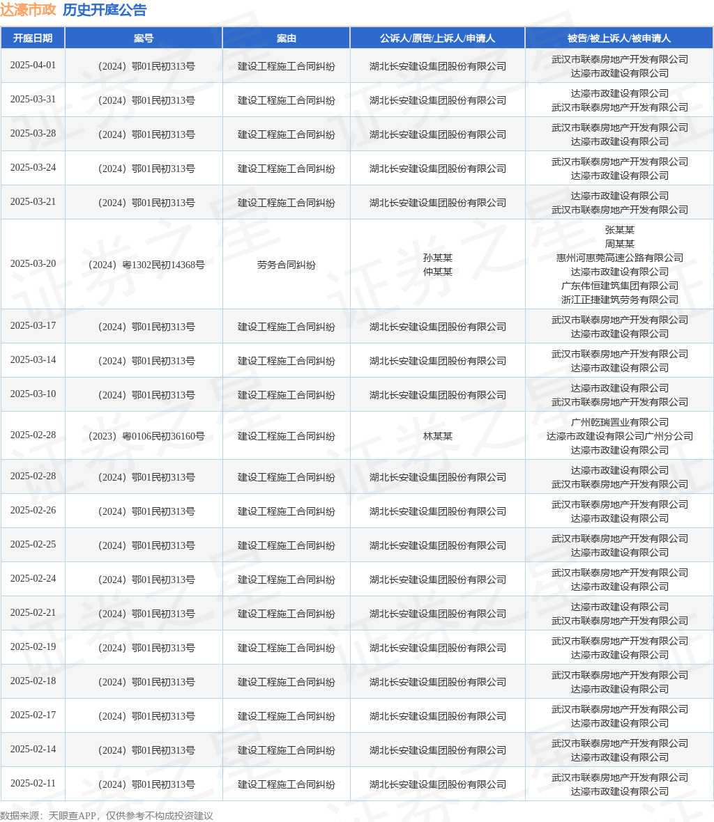 案号:(2024)鄂01民初313号审理法院:湖北省武汉市中级人民法院案由:建设工程施工合同纠纷当事人信息: 原告/上诉人:湖北长安建设集团股份有限公司 被告/被上诉人:武汉市联泰房地产开发有限公司、达濠市政建设有限公司开庭日期:2025年2月26日根据统计,近一年内以达濠市政建设有限公司为当事人的历史开庭公告有71则,其中案由为“建设工程施工合同纠纷”的公告以49则居首,其次为“劳动争议”有6则,“劳务合同纠纷”有5则。历史开庭公告(前20条)如下: